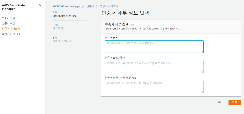그리고 AWS Certificate Manager에서 인증서 가져오기로 방금 인증서 정보들을 넣어준다.