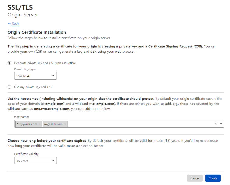 우선 클라우드플레어로 SSL/TLS->Origin Server 탭으로 이동한다.