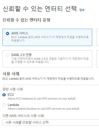 내 경우에는 EC2로 했다. 이러면 EC2에만 달 수 있는 역할이 된다.