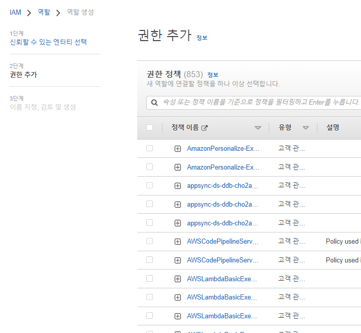 그다음에는 역할에 부착할 정책들을 연결한다.