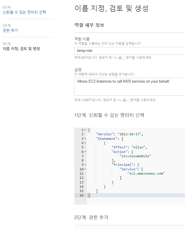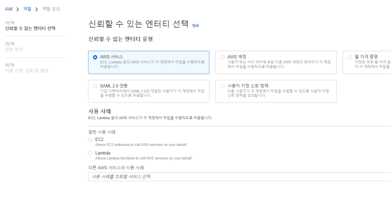 생성 창에 들어가면 신뢰 관계(trust policy)라는 것을 먼저 정하라고 한다.