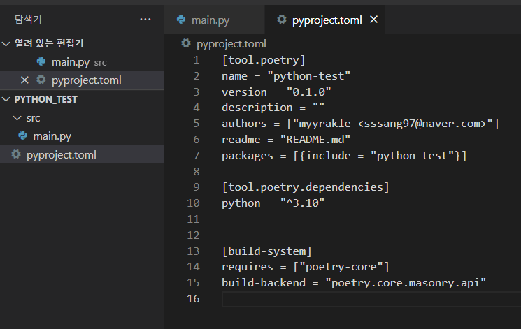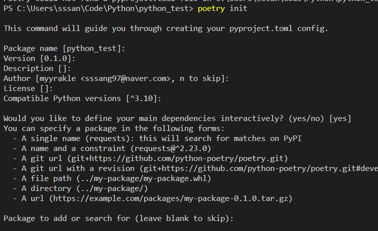 poetry를 쓰려면 먼저 프로젝트에 기본 구성을 초기화해줘야 한다.