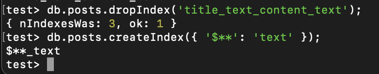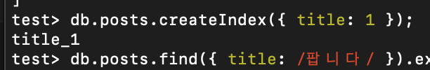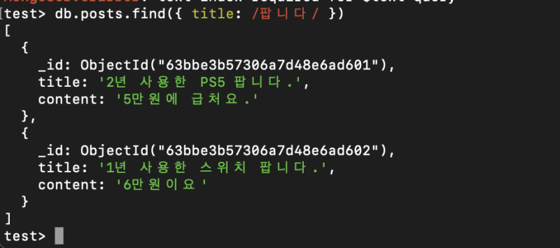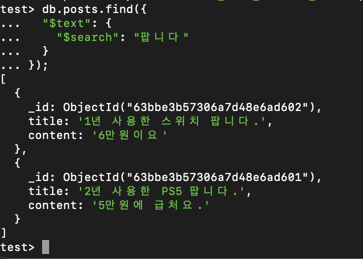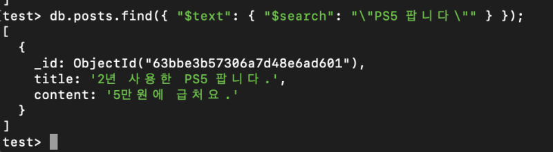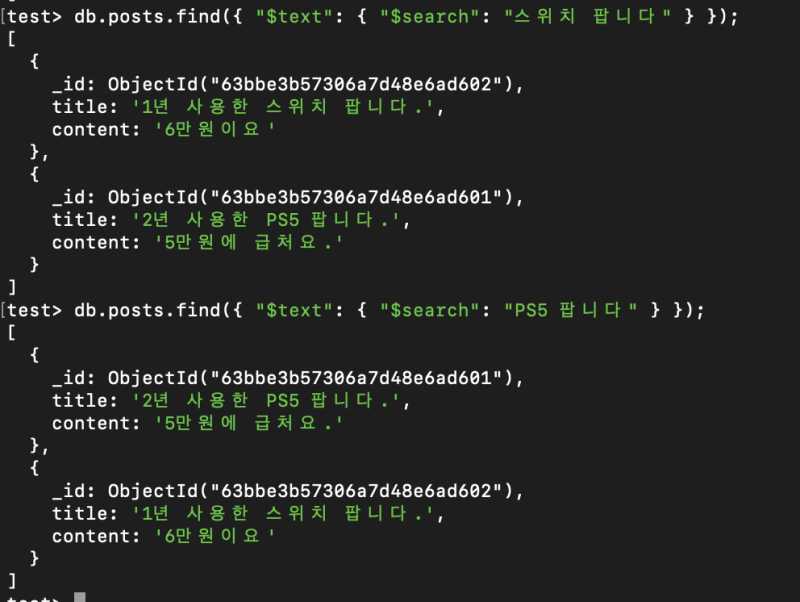 이러면 text 인덱스가 걸린 모든 필드에 대해 검색을 수행한다.