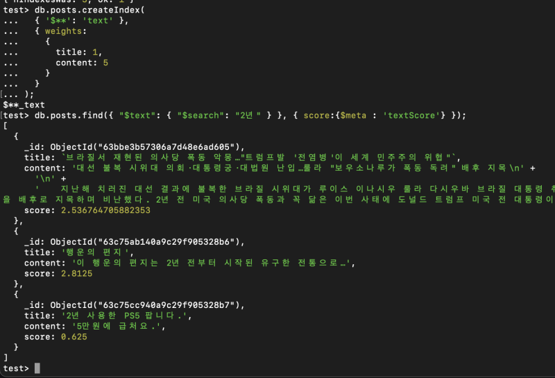 다행히도 mongoDB는 이런 경우에 맞는 텍스트 인덱싱 기능을 제공한다. 전용 시스템인 elasticsearch 같은 것과 비교하면 좀 부족하긴 하지만, 대강 비슷하게 tokenizing과 가중치 설정 등이 가능하다.