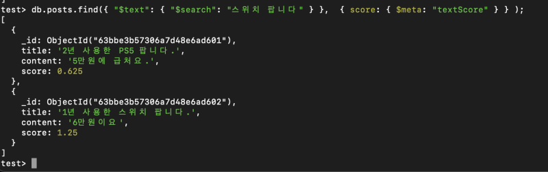 db.posts.find({ "$text": { "$search": "스위치 팝니다" } }, { score:{$meta : 'textScore'} });