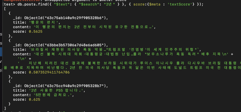 이건 또 "textScore"라는 걸 통해 검색 일치도 점수를 쌓고 그걸 내림차순으로 뿌려줘서 그런 것이다.