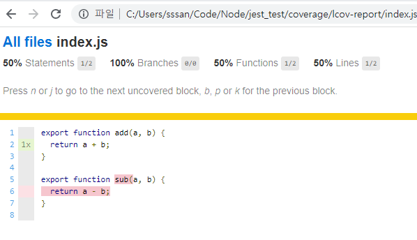 ๊ตฌ๋ฌธ ๋จ์์ ์ปค๋ฒ๋ฆฌ์ง๋ ์๋ณธ์์ค์ ์ ์ฒด ๊ตฌ๋ฌธ ์ค์์ ๋ช๊ฐ์ ๊ตฌ๋ฌธ์ด jest test ํ์ผ์์ ํ