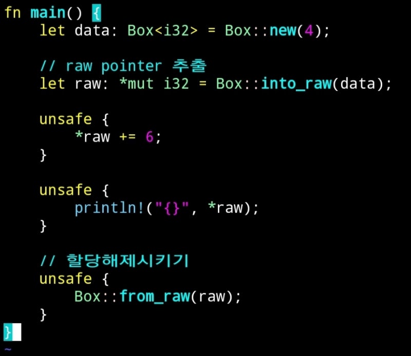 Box::into_raw 함수를 이용하면 기존의 Box에게서 제어권을 강탈하고 자유로운 raw 포인터를 가져올 수 있다.