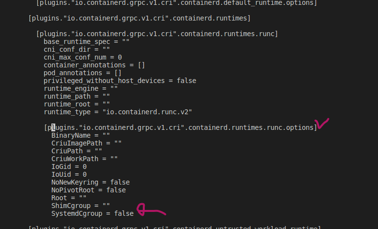 containerd는 따로 뭘 설정하지 않으면 기본설정으로 돌아가는데, 그러면 쿠버에서 이걸 쓸 수가 없다.