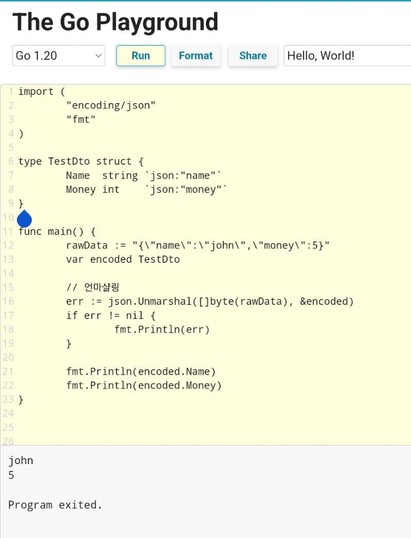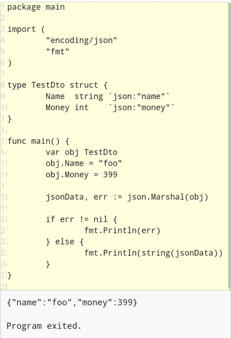์ด๊ฑด ๋ํ์ ์ผ๋ก Go์ ๊ตฌ์กฐ์ฒด ํ์ ์ json์ผ๋ก ์ธ์ฝ๋ฉ/๋์ฝ๋ฉํ ๋ ์์ฃผ ์ฌ์ฉ๋๋ค.