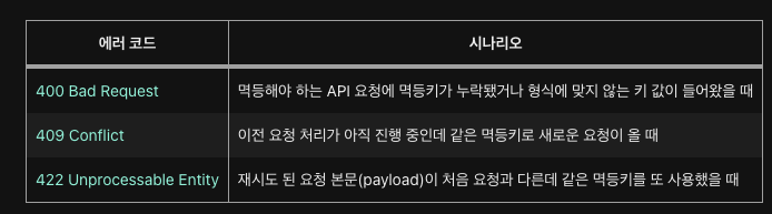 - ์๋ฒ๋ ๋์ผํ "Idempotency-Key"์ผ๋ก ๋ค์ด์จ ์์ฒญ์ ๋ํด์, ์ฒซ๋ฒ์งธ๋ก ๋ค์ด์จ API ์์ฒญ๋ง ์ ๋๋ก ์ฒ๋ฆฌํ๊ณ , ์ดํ์ ๋ค์ด์จ๊ฑด status 409๋ฅผ ๋์ง๊ฑฐ๋ ์ด์ ์ ๋ค์ด์๋ ๋ฆฌ์คํฐ์ค๋ง ๊ทธ๋๋ก ๋๋ ค์ค๋ค.