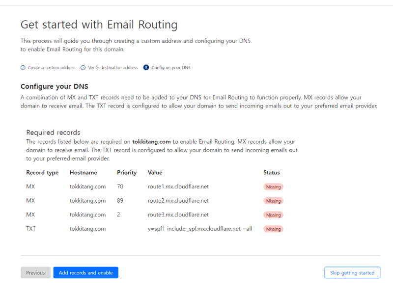 여기에서는 Cloudflare를 통해서 이메일에 도메인을 연동하는 것을 시도해보겠다.