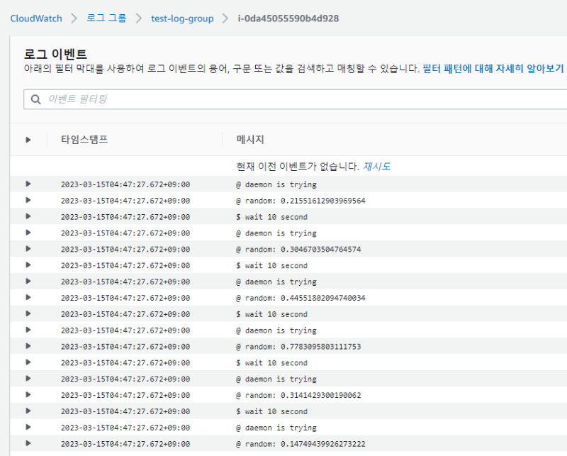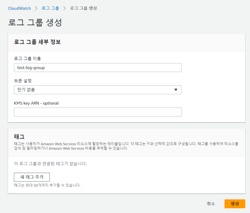 ์ฌ๊ธฐ์๋ ํ๋ก์ธ์ค์์ ๋ฐ์ํ ํ์ค ์ถ๋ ฅ์ cloudwatch์ ์ ์ฅํ๋๋ก ๊ตฌ์ฑ์ ํ๋ฒ ํด๋ณด๊ฒ ๋ค.