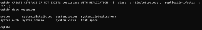CREATE KEYSPACE IF NOT EXISTS test_space WITH REPLICATION = { 'class' : 'SimpleStrategy', 'replication_factor' : '1' };