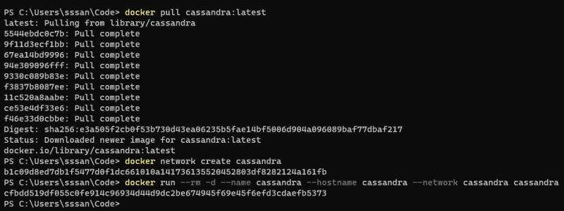docker run --rm -d --name cassandra --hostname cassandra --network cassandra cassandra