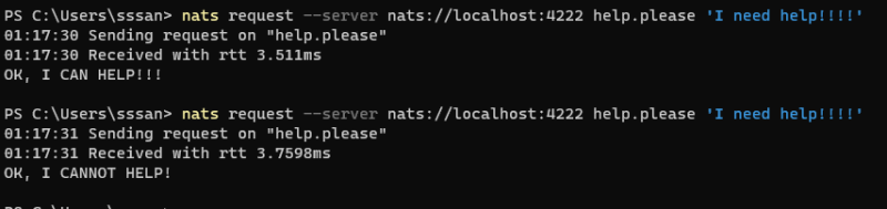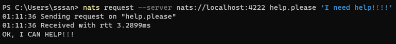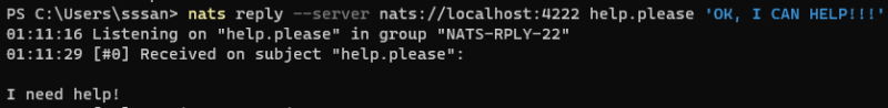 nats reply --server nats://localhost:4222 help.please 'OK, I CAN HELP!'