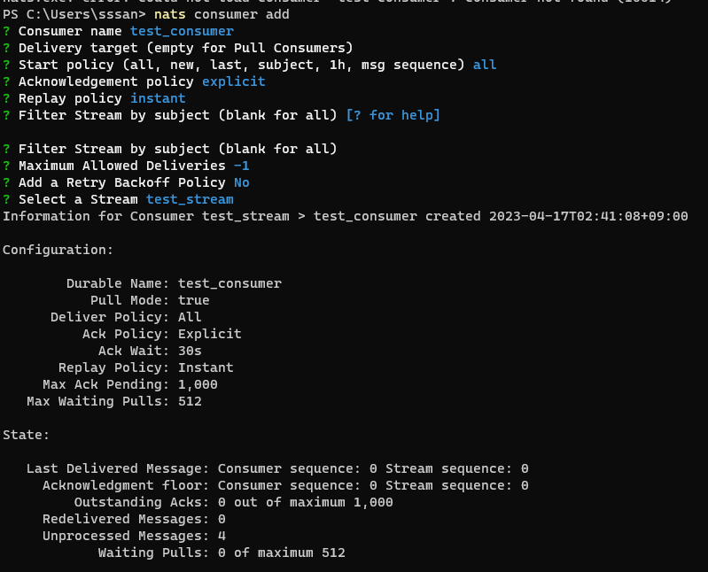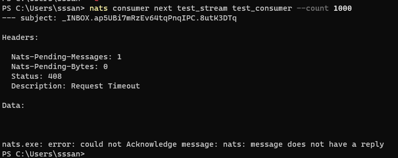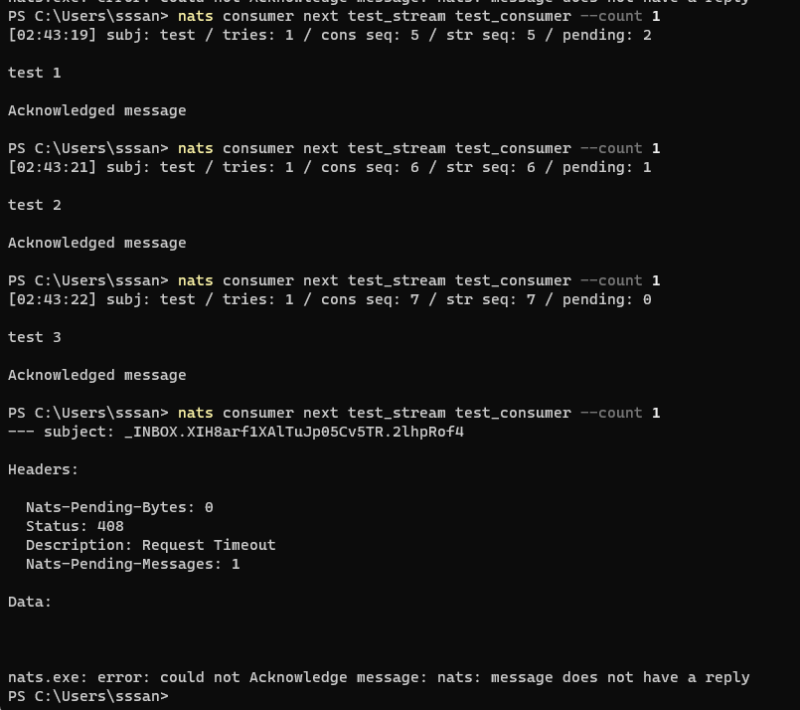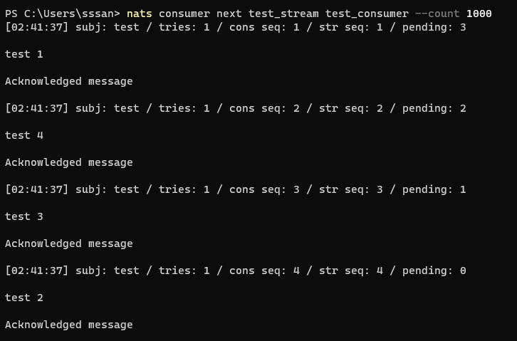 nats consumer next [stream] [consumer] --count [๊ฐ์ ธ์ฌ๊ฐ์]nats consumer next test_stream test_consumer --count 1000