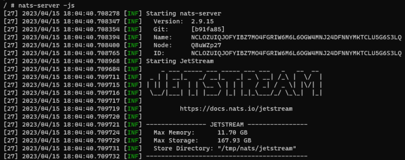 docker run -idt --name nats --network nats --rm -p 4222:4222 -p 8222:8222 nats:2.9.15-alpine3.17 --http_port 8222
