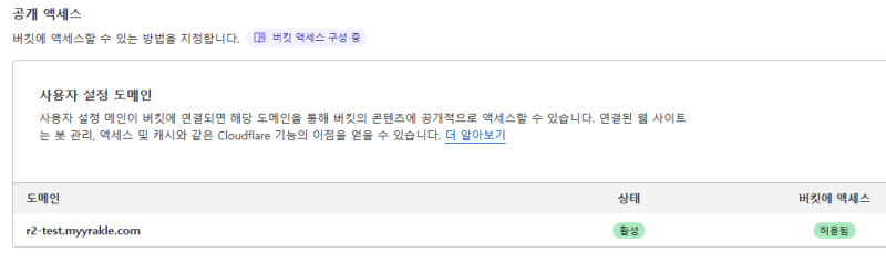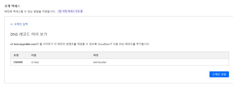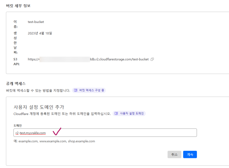 R2๋ S3์ ๋ค๋ฅด๊ฒ public endpoint๋ฅผ ์์ฒด์ ์ผ๋ก ์ ๊ณตํ์ง๋ ์๊ณ , ๋๋ฉ์ธ์ ์ถ๊ฐ์ ์ผ๋ก ์ฐ๋ํด์ ์ฐ๋๊ฑธ ๊ถ์ฅํ๋ค.