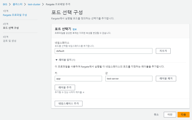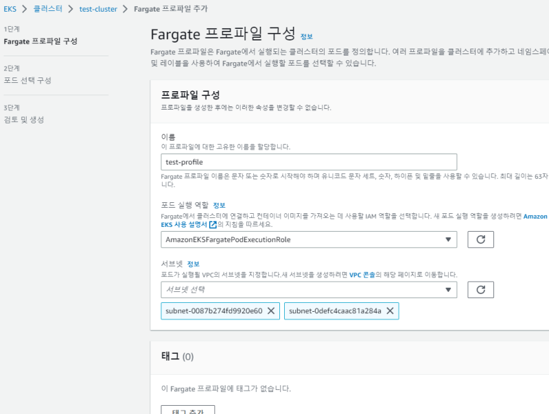 Fargate profile ์ ์ฉ ์ญํ ์ ํ๋ ๋ง๋ ๋ค.
