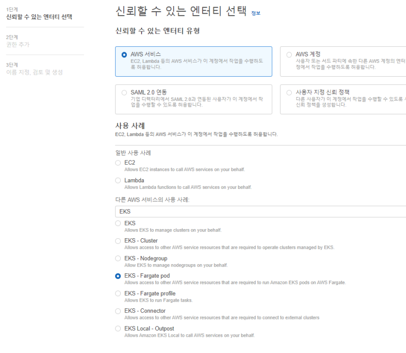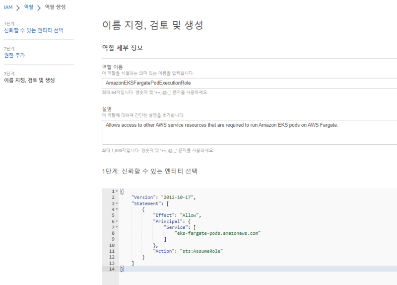์ด๋ฆ์ AmazonEKSFargatePodExecutionRole๋ก ํด์ค๋ค.
