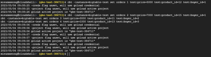 cbt -instance=bigtable-test set orders 2 test:price=7000 test:product_id=15 test:buyer_id=1