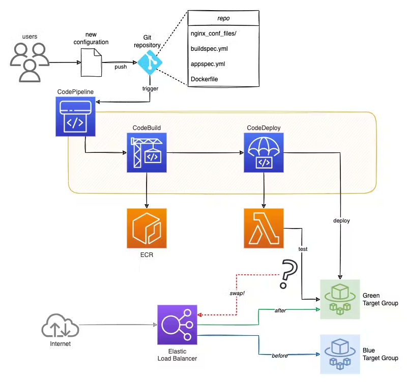 CodeDeploy๋ฅผ ์ฌ์ฉํ๊ณ target group์ ๋น๋กฏํ ๋ช๊ฐ์ง ๊ตฌ์ฑ์ ์ถ๊ฐํ๋ฉด ์ด๋ฅผ ๋ฌ์ฑํ ์ ์๋ค.