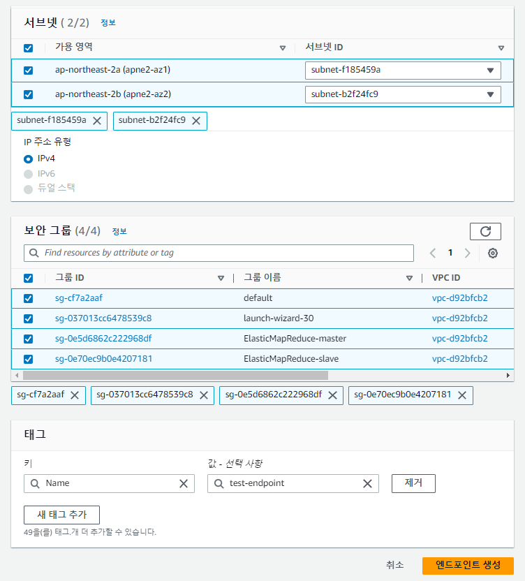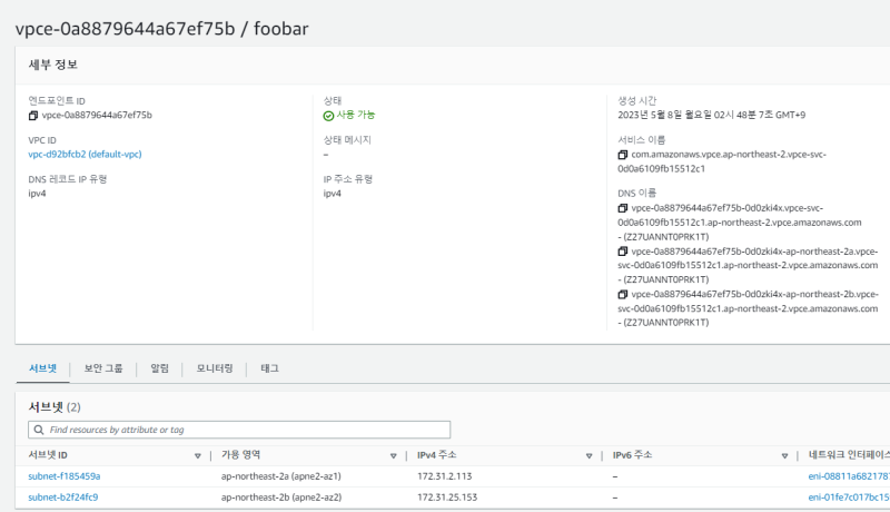 ์ด๊ฑด default-vpc์ ๋ํด์ ๋ง๋ ์๋ํฌ์ธํธ๋ผ์, ์ ๋๋ฉ์ธ๋ค์ default-vpc ๋ด์์๋ง ์ฌ์ฉํ ์ ์๋ค.