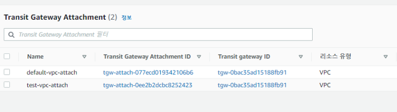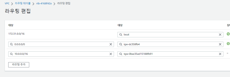 default vpc์ ์๋ธ๋ท๋ค์ ๋ผ์ฐํ ํ ์ด๋ธ์๋, test vpc CIDR -> ๊ฒ์ดํธ์จ์ด๋ก ๋งคํ๋๊ฒ ํ๊ณ , ๊ทธ ๋ฐ๋๋ ๋ ธ๊ฐ๋ค๋ฅผ ์น๋ค.