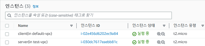 default-vpc์ test-vpc 2๊ฐ๋ฅผ ๋๊ณ , ๊ฐ๊ฐ์ EC2 ์ธ์คํด์ค๋ฅผ ํ๋์ฉ ๋ง๋ค์๋ค.