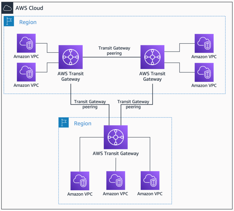 Transit Gateway์ ํฌํจ๋ VPC๋ผ๋ฆฌ๋ ์๋ก ํต์ ์ด ๊ฐ๋ฅํ๋ฉฐ, Gateway๋ผ๋ฆฌ peering์ ํ๋ฉด ๋ค๋ฅธ ๊ฒ์ดํธ์จ์ด์ VPC๋ผ๋ฆฌ๋ ํต์ ์ ๊ฐ๋ฅํ๋ค.