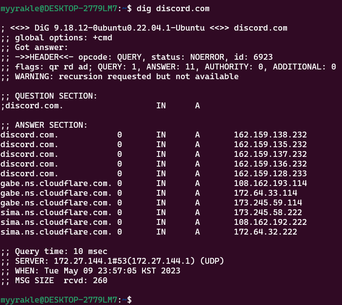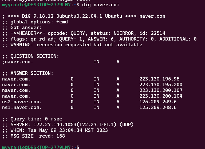 유닉스 계열에서는 dig 명령을 통해 도메인이 뭘 어떻게 가져와주는지 조회해볼 수 있다. windows에서는 nslookup을 사용할 수 있는데, dig가 더 정보를 많이 주는 편이다.