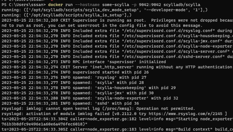 docker run --hostname some-scylla -p 9042:9042 scylladb/scylla