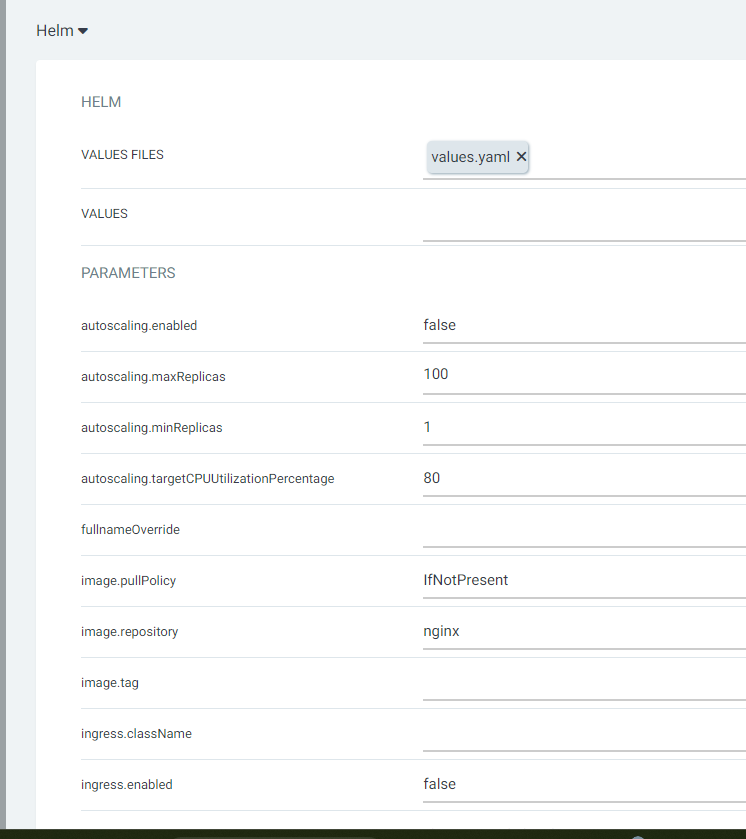 여기서 제대로 helm 파일을 인식했다면, 아래에 Helm 설정 탭이 생길 것이다.
