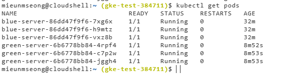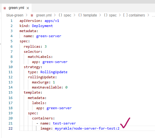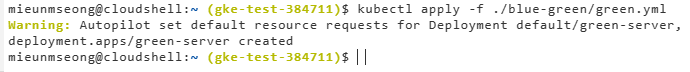 그리고 현재 프로덕션 서버가 blue라면, 서비스와 연결되어있지 않은 green 버전에 새 컨테이너를 달아서 파드를 띄운다.
