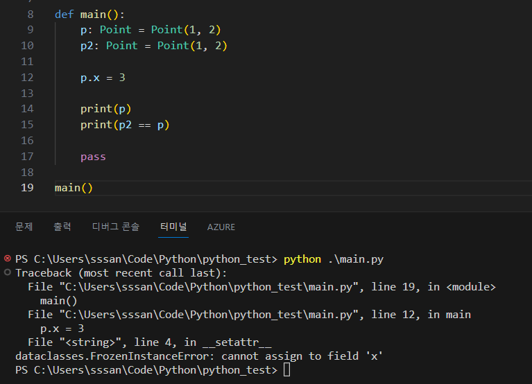 dataclass의 또 하나의 유용한 기능은 불변성 부여가 가능하다는 것이다.