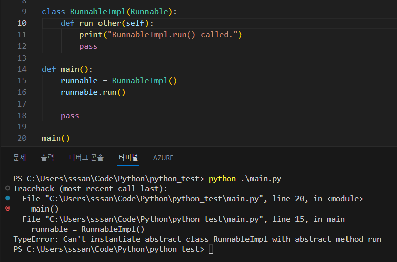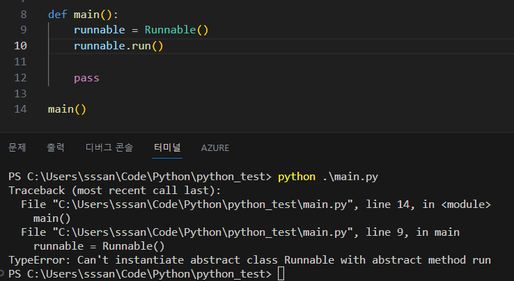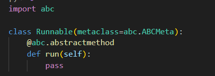 다음과 같이 메타클래스를 지정해준 다음에, 추상 메서드로 정의할 함수 위에 데코레이터를 달아준다.