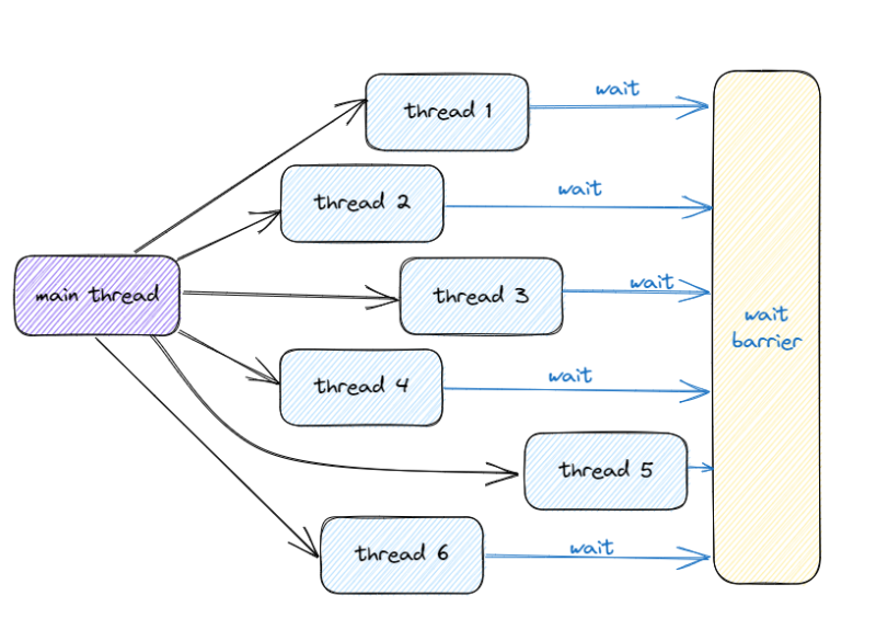 barrier.wait(); // 6κ°κ° μ λΆ μ¬κΈ°μ λλ¬ν λκΉμ§ κΈ°λ€λ¦Ό