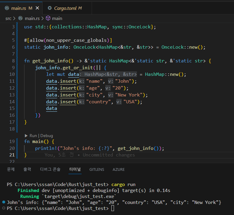 일단 전역변수는 반드시 초기화가 되어야하는데, 전역변수의 초기화 식은 const-표현식만 들어갈 수 있어서 HashMap::new 같은 생성 함수 자체를 사용할 수가 없다.