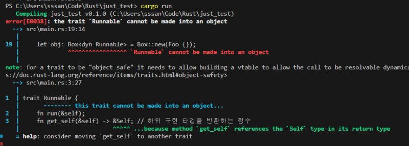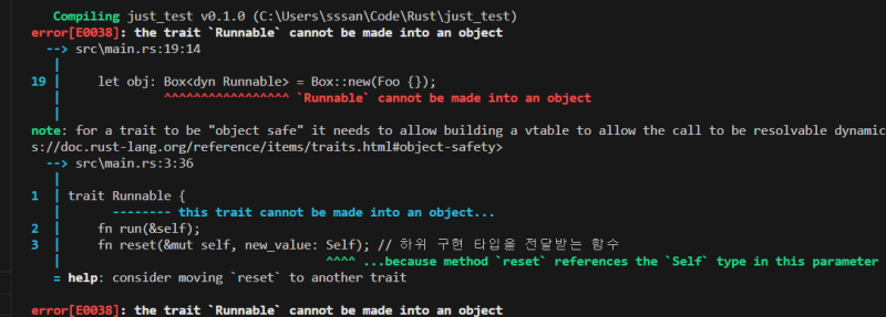 trait์ด object safetyํ์ง ์์์ก๊ธฐ ๋๋ฌธ์ด๋ค.