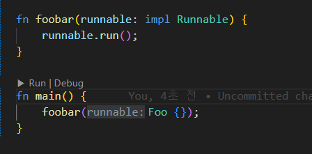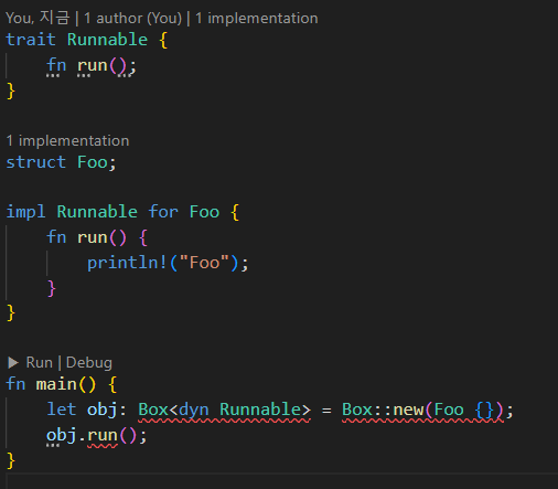 ๊ทธ๋์ trait์ ๋ฉ์๋๋ค์ ๊ณตํต์ ์ผ๋ก vtable์ ์ ์ฌ๋์ด ๋ฐํ์์ ๋ช