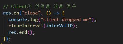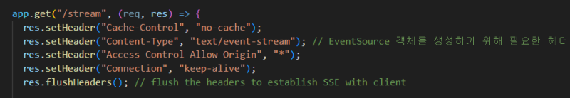 res.setHeader("Content-Type", "text/event-stream"); // EventSource ๊ฐ์ฒด๋ฅผ ์์ฑํ๊ธฐ ์ํด ํ์ํ ํค๋