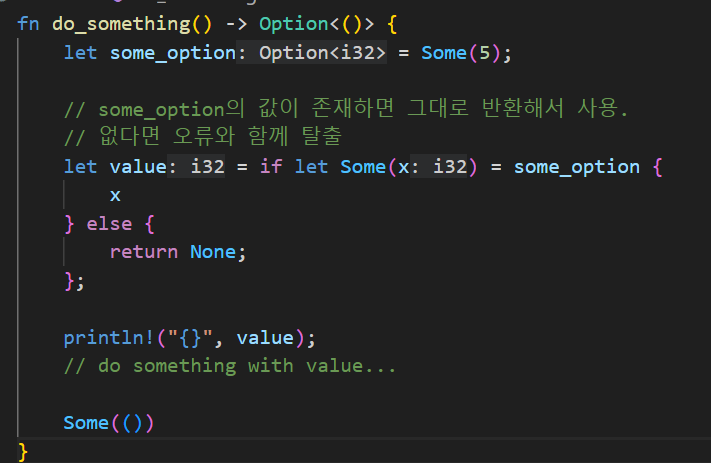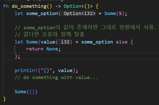 ๊ทธ๋์ ์ด๋ฐ ๊ฒ์ ๋ํ ํจ์ถ์ ์ธ sugar ์ ํ์ค๋ก ๋์จ๊ฒ let-else๋ฌธ์ด๋ค.