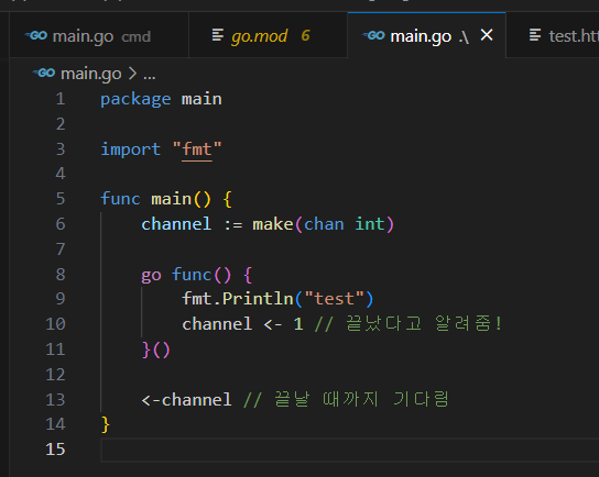 보통 Go에서는 채널 등을 활용해서 비동기 프로세스들을 동기화하고 합을 맞춘다.