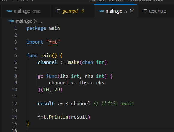 아래는 단순한 덧셈 함수를 고루틴으로 구현한 것이다.