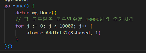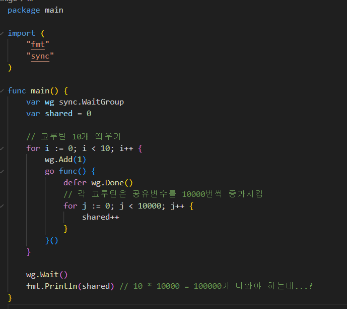 fmt.Println(shared) // 10 * 10000 = 100000๊ฐ ๋์์ผ ํ๋๋ฐ...?