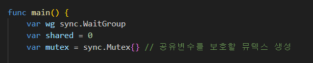 var mutex = sync.Mutex{} // ๊ณต์ ๋ณ์๋ฅผ ๋ณดํธํ ๋ฎคํ
