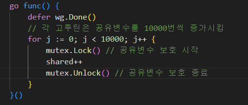 mutex.Unlock() // ๊ณต์ ๋ณ์ ๋ณดํธ ์ข