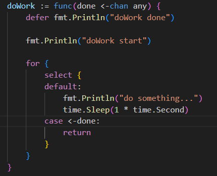 그리고 for-select 루프에서 done이 종료되거나 메세지가 오면 강제로 리턴하도록 구성하는 것이다.