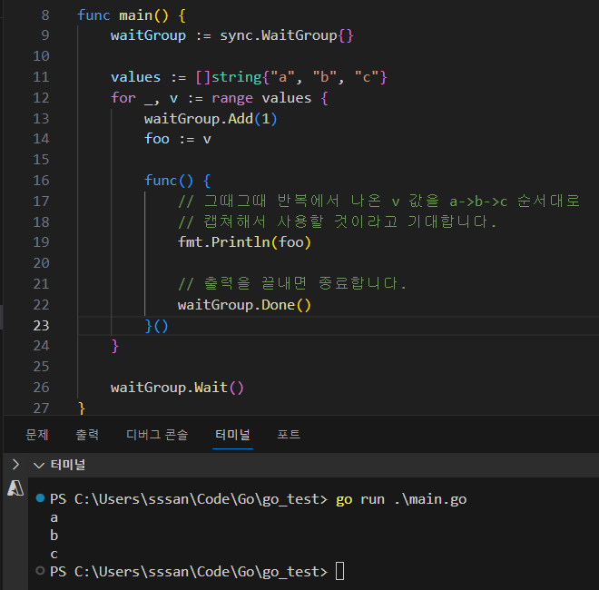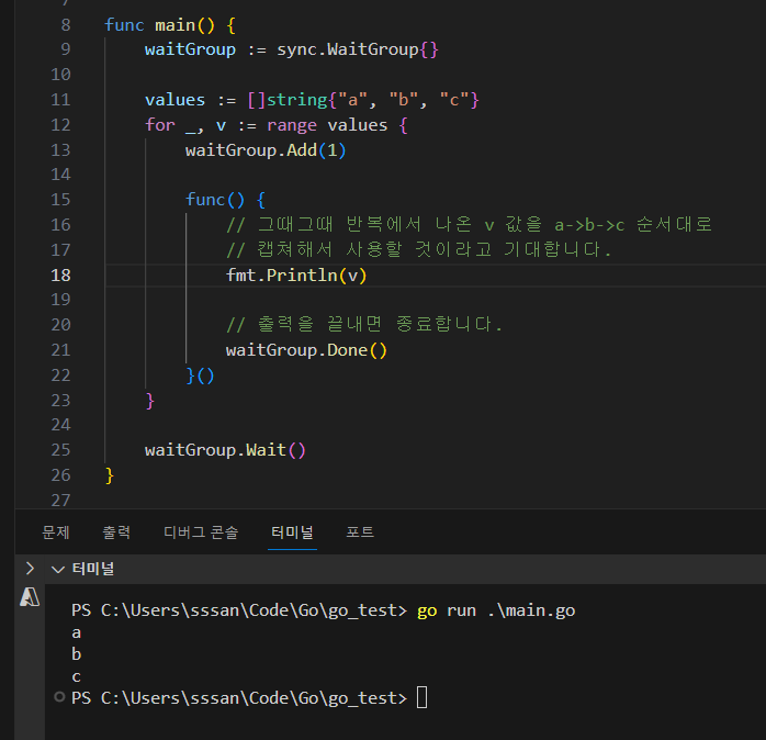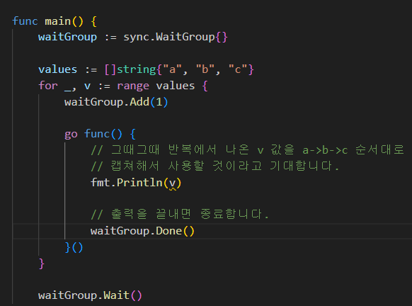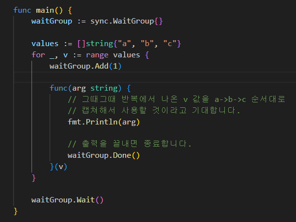 가장 깔끔한 해결책은, 고루틴에 값을 전달할때 캡쳐보다는 매개변수 전달을 이용하는 것이다.